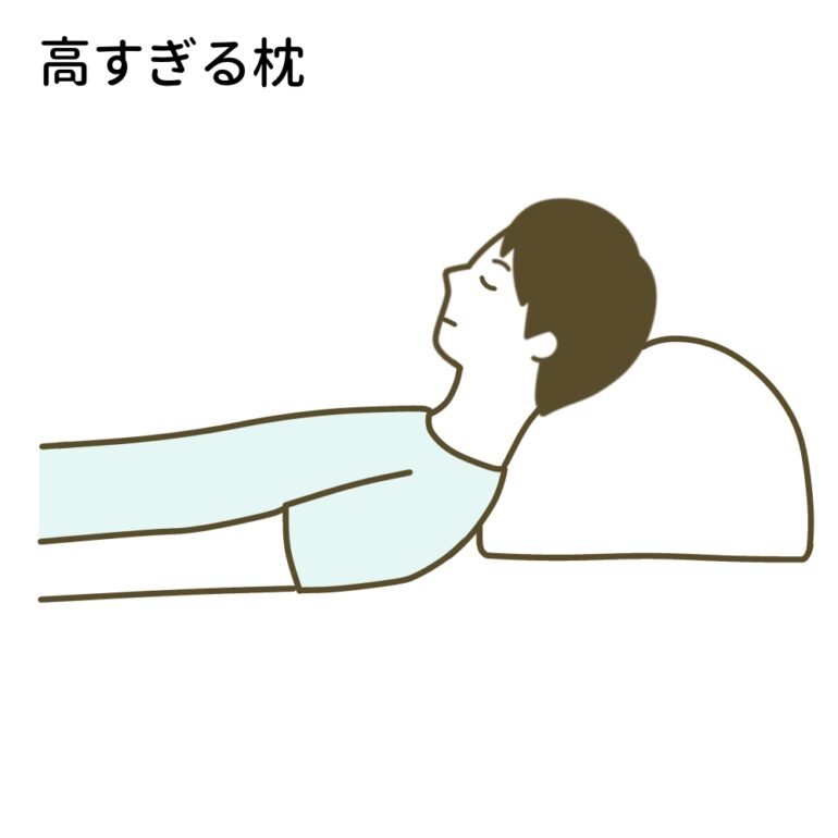 枕が高すぎると、首が前に曲がった状態で固定され、頸椎(首の骨)の自然なカーブが失われやすくなります。その結果、首や肩の筋肉に負担がかかり、血流の悪化・こり・頭痛・ストレートネックの原因となります。理想的な枕は、仰向けに寝たときに首のカーブを自然に支え、あごが上がりすぎない高さです。